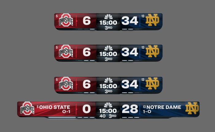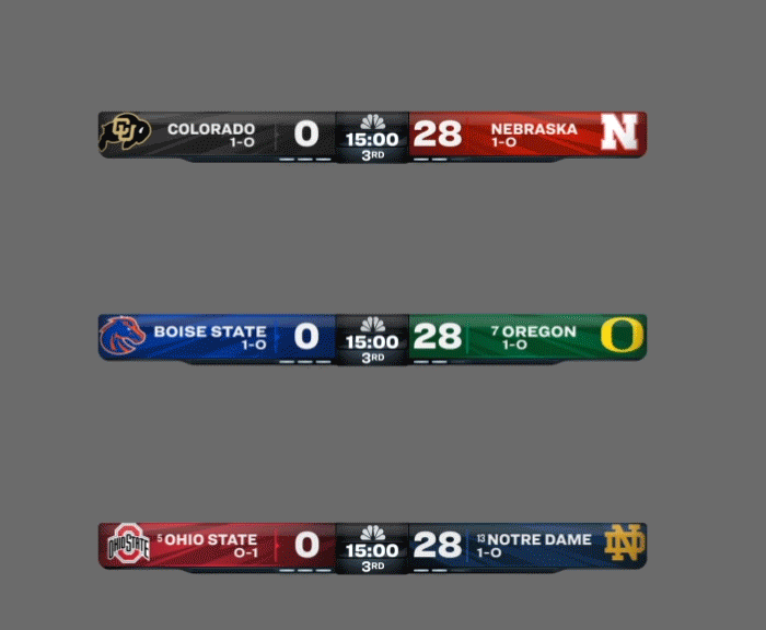 However you want to call it, I was tasked to animate all the functions for big10 Football and Basketball. I also templated the project to be versioned out for all the teams in the Big 10 conference. The initial layout/design of the graphic was developed by the talented director, Chad Hudson.